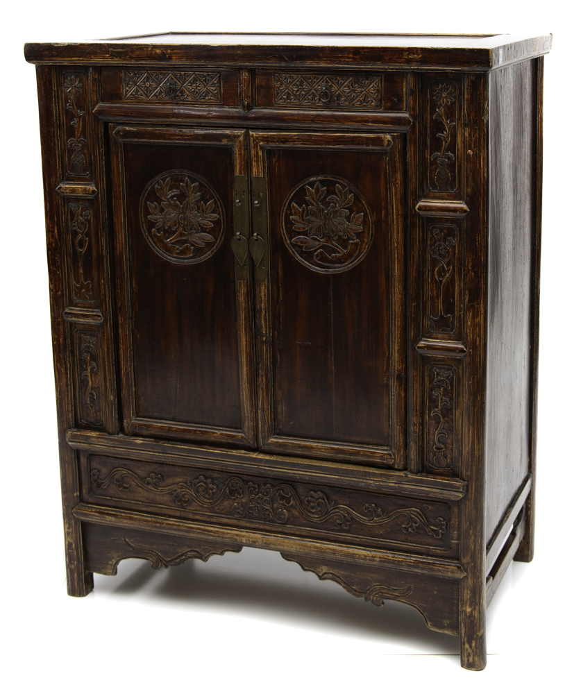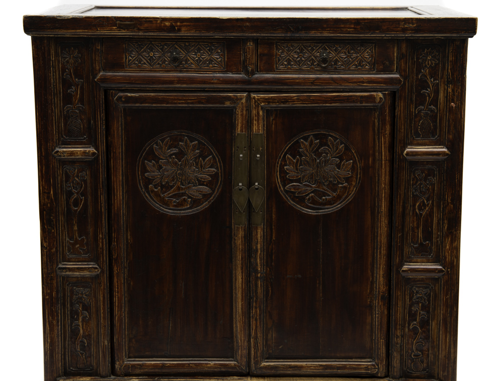Some cabinets showcase unadorned elegance, highlighting clean lines and natural wood grain; Others feature rich colours and intricate motifs, often symbolizing good wishes or depicting folklore. This rich heritage of Chinese antique cabinets offers a range of options for modern interiors, combining historical craftsmanship with timeless appeal. This cabinet has peony medallions. The word for peony is Fugui hua and fugui means wealth and honour. Therefore the peony represents a wish for prosperity. Chrysanthemum, plum blossom and orchid flowers are on the side panels. The cabinet has a rich plum red lacquer. Lacquer was invented in China approx. 8000 years ago and is sourced from a few species of trees native to China. Producing lacquer was an expensive and time-consuming process. It was applied to preserve the timber and enhance the aesthetic appeal of the furniture.
