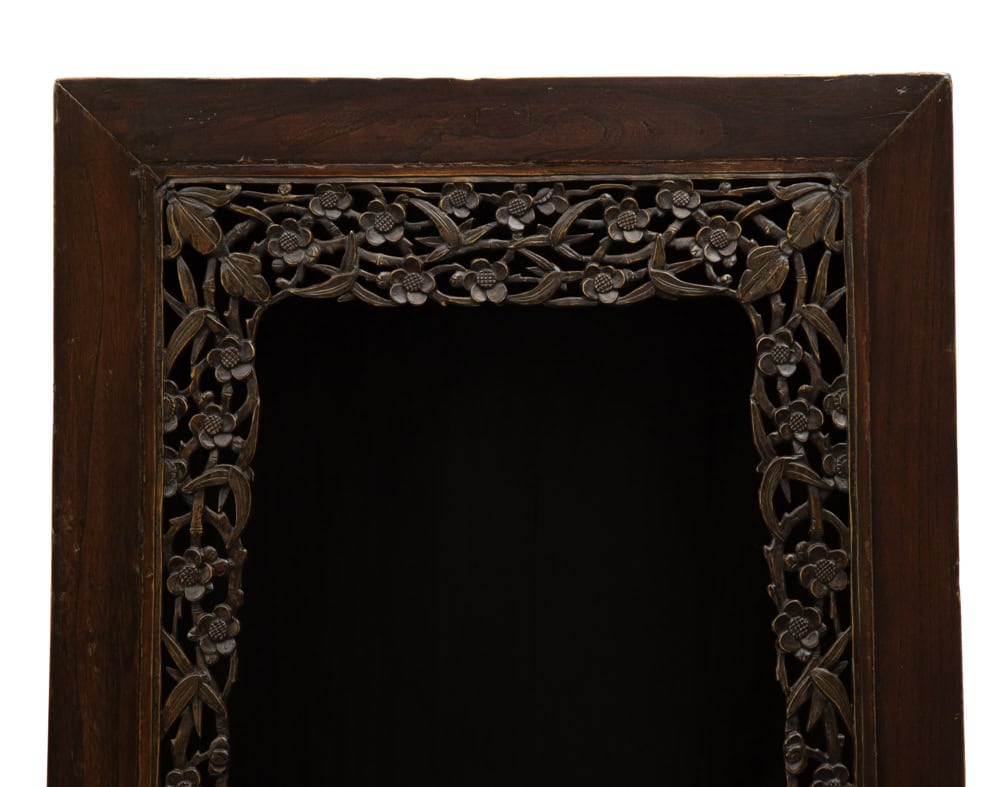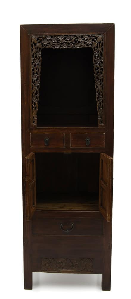 Some cabinets showcase unadorned elegance, highlighting clean lines and natural wood grain; Others feature rich colours and intricate motifs, often symbolizing good wishes or depicting folklore. This rich heritage of Chinese antique cabinets offers a range of options for modern interiors, combining historical craftsmanship with timeless appeal. This cabinet has open carving of plum blossoms representing the Five Blessings of happiness, long life, good health, love of virtue and a peaceful passing. the bottom apron has relief carving of peach blossom representing long life. It has original metal fittings.